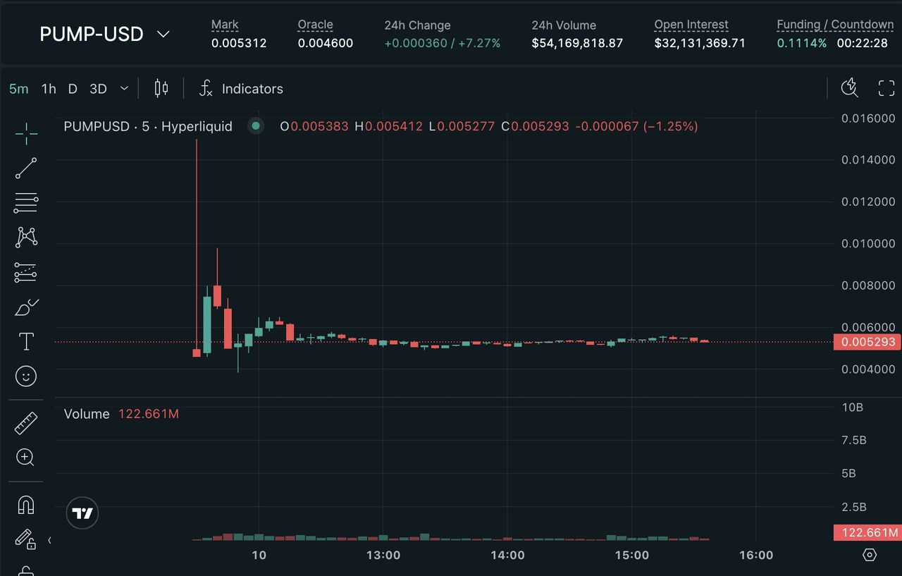 在正式启动之前,$PUMP开始在Hyperliquid上以永久合约的形式交易,并迅速获得了吸引力。该代币的开盘价格为$0.00529,比其公开发售价格$0.004高出近40%。在前24小时内,$PUMP-USD交易对创造了超过3000万美元的交易量,未平仓合约增长至超过1700万美元。这一早期需求表明,交易者预期该代币在可转移后会有强劲的上市表现。