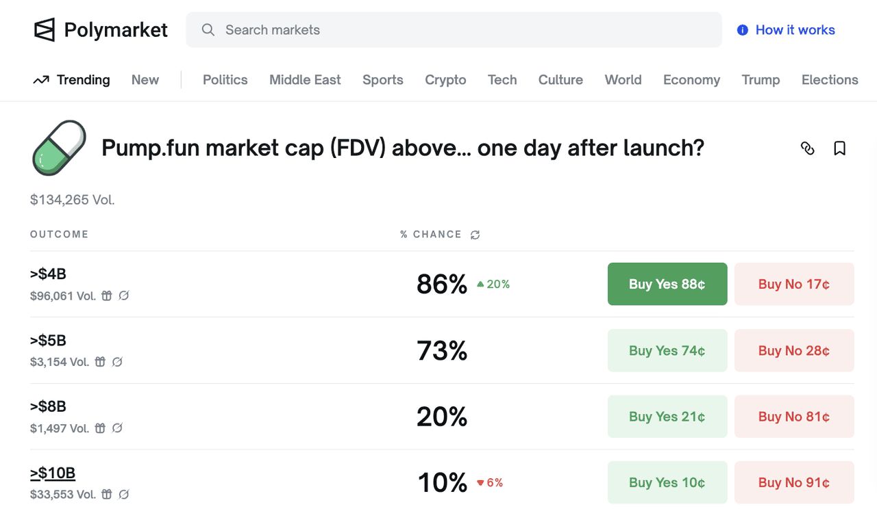 预测市场也在评估$PUMP 上线后的估值。在Polymarket 上,交易者正在对Pump.fun 的完全稀释估值(FDV)进行赌注,即上线后的第一天。目前的市场情绪显示出对其数十亿美元首发的强烈信心: