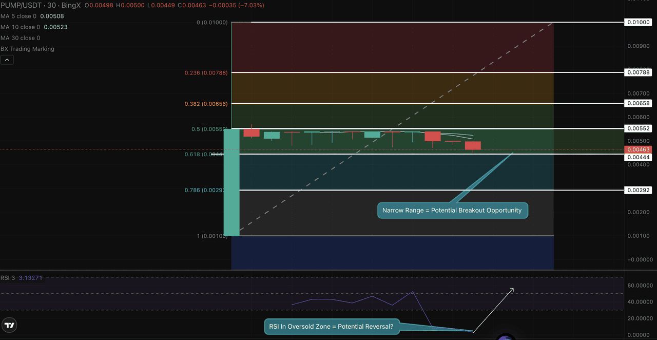 30分钟图表显示出PUMP/USDT经典的拉升后回落,随后进入横盘整理阶段。在初始大幅上涨后,价格急剧回调,回落至50%和61.8%的斐波那契回撤位,这表明早期买家可能正在获利了结。