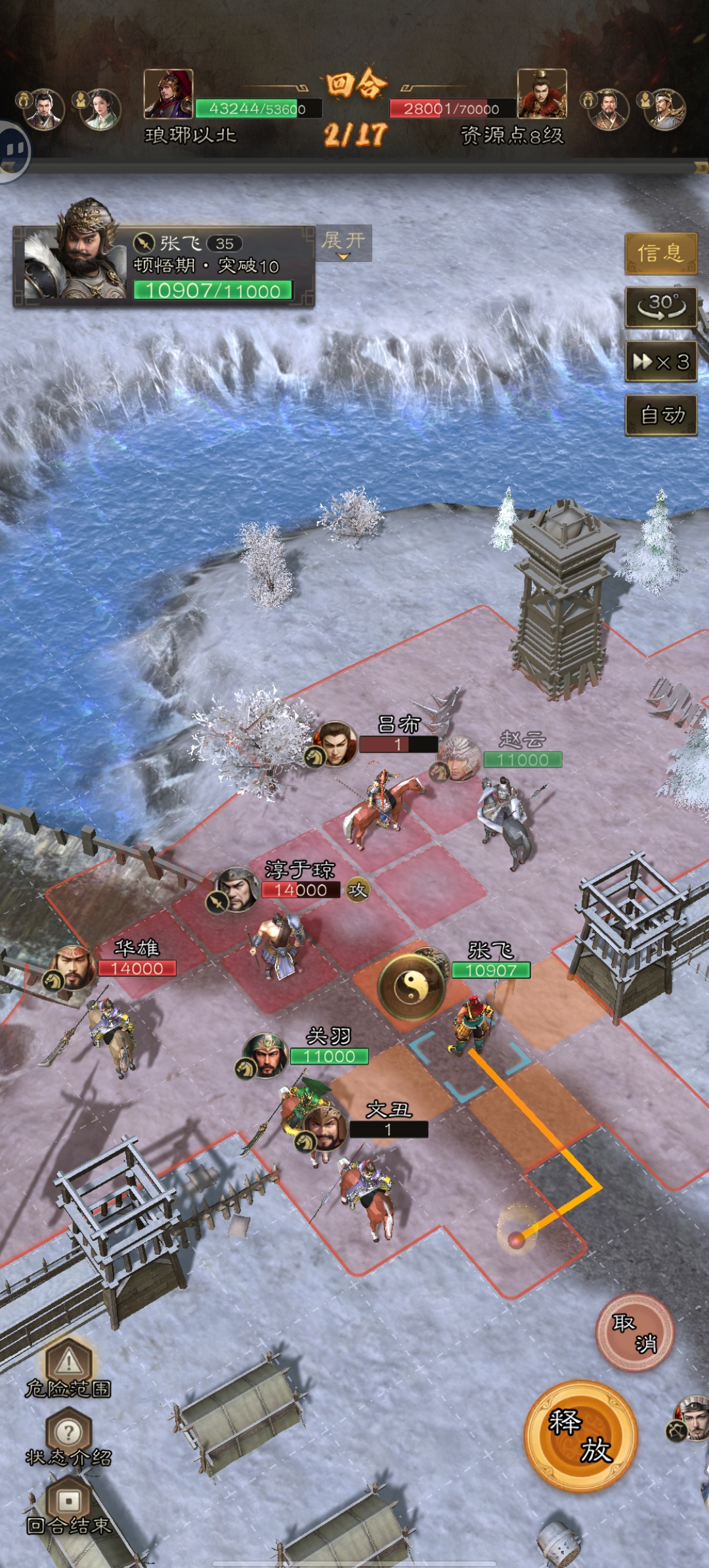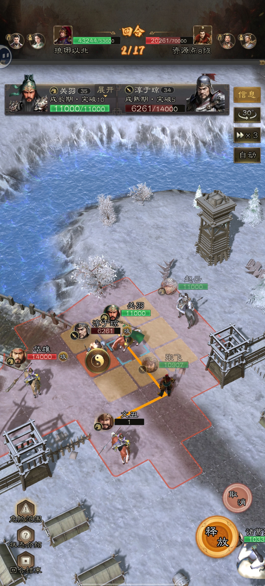 6.关羽释放一技能,收割残血;文丑行进至华雄前方,技穷华雄!