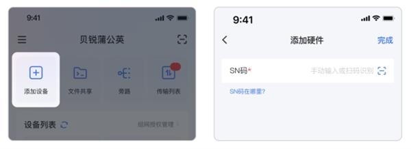 然后在手机上下载并登录贝锐蒲公英App,点击「添加设备」,扫描机身 SN 条码完成绑定。