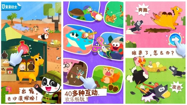 多达几十种不同生活习性的动物,会在《宝宝动物世界宝宝巴士》中登场,同时根据它们的生活习性,游戏也会构造对应的森林、沙漠、草原、海洋等生态背景,令宝贝们不仅可以认识各种动物,还能了解动物们的生活习惯以及生存环境。此外小朋友还能化身成为动物小助手,例如帮助蓝鲸将身体中的海洋垃圾取出,为啄木鸟消灭害虫保护树木健康等。