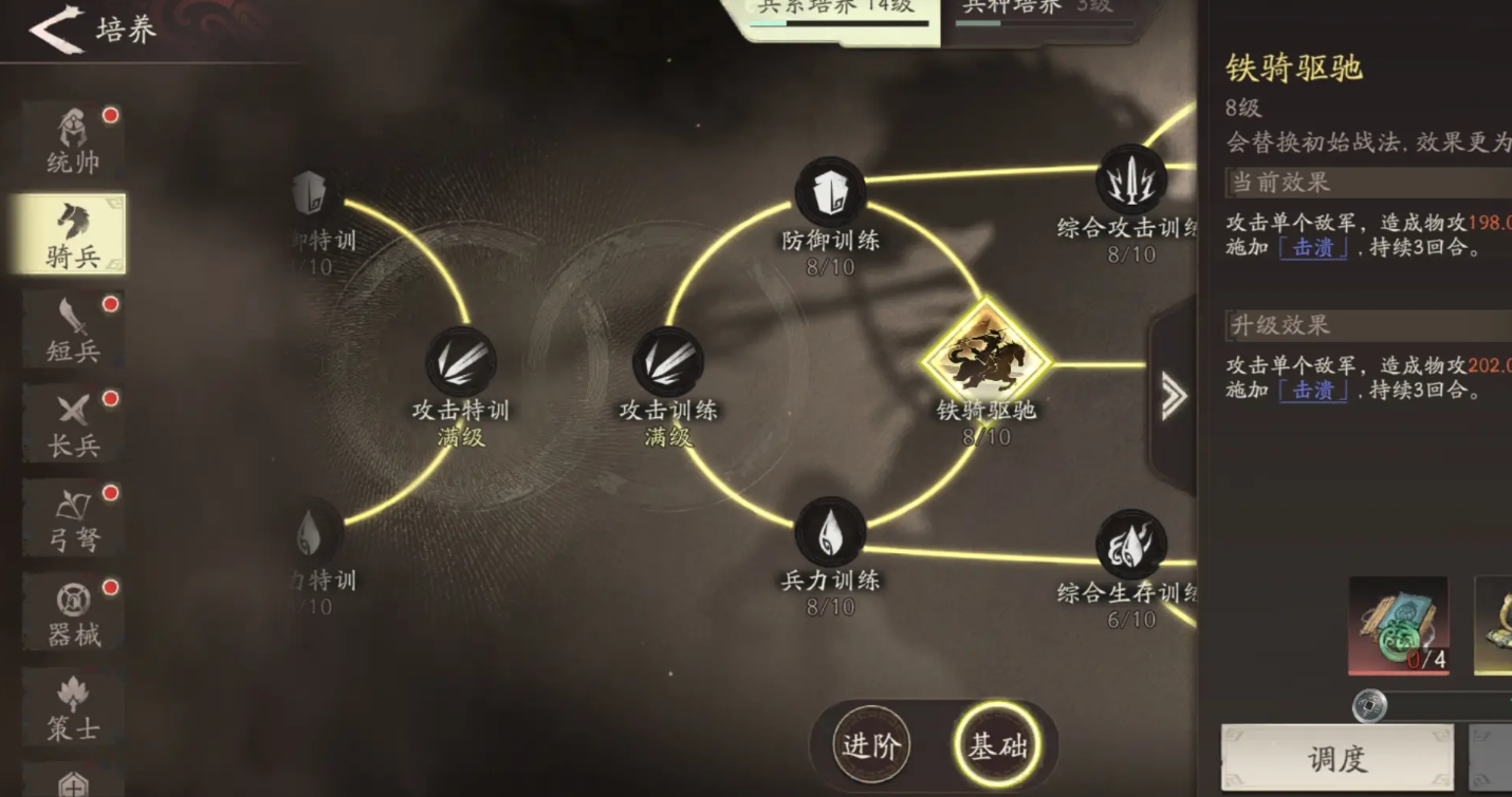 若后期阵容策略发生转变,比如转向骑兵主导流派,玩家可重新调整曹操的授官路线,切换至骑兵体系。一旦新路线解锁,便能进一步激活专属训练技能,如攻击训练、防御训练、兵力训练,以及特殊技能铁骑驱驰,全面提升部队作战效能。