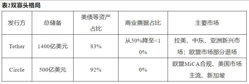 过去五年,稳定币从边缘工具跃升为主流金融基础设施。根据贝恩、罗兰贝格和德勤(2025)的数据,全球稳定币流通市值从2019年不足20亿美元增至2025年初超2000亿美元。截至2025年,USDT(Tether)和 USDC(Circle)占据稳定币市场85%以上份额。Tether 主要服务新兴市场,储备资产中美债等高流动性资产规模达1160亿美元,占全球稳定币储备58%。USDC 凭借合规和透明优势,在欧盟、新加坡等发达市场广泛应用,储备超500亿美元。