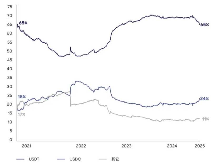 稳定币的核心参与方是发行机构,其商业模式、储备管理方式直接决定了稳定币的信誉和市场接受度。截至2025年初,全球稳定币市场已形成以 Tether(USDT) 和 Circle(USDC) 为主导的双寡头格局。其盈利模式主要来源于以下几个方面:一是储备资产收益。发行方持有的大规模美债、回购协议、存款等资产可产生可观利息收入。以Tether为例,其2024年美债和等价资产投资收益达数十亿美元,成为其核心盈利来源。二是手续费与交易佣金。三是合作生态盈利。与支付平台、银行、钱包服务商合作形成的生态佣金、清算分成。尽管如此,其盈利模式的可持续性仍高度依赖储备资产安全性、市场信任度及监管态势变化。