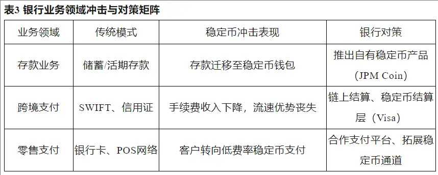稳定币的快速发展给传统银行体系带来了系统性挑战,尤其在以下几方面表现突出:一是存款分流。稳定币钱包和非托管账户作为替代性价值存储手段,逐渐分流原本属于银行的活期和储蓄存款。二是支付业务收入受挤压。稳定币的低成本、高效率特性直接冲击SWIFT等传统支付渠道。据估算大约蚕食银行约 300 亿美元年化手续费收入。而银行的应对策略主要包括自发推出稳定币、构建链上结算网络以及与稳定币发行方合作。