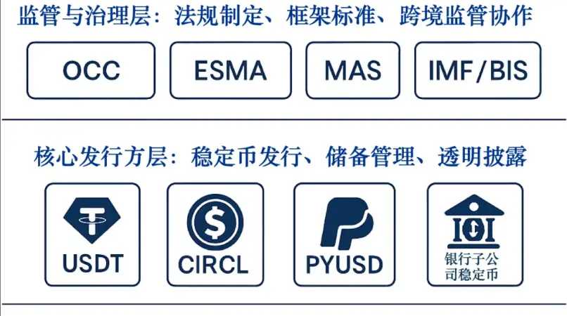 稳定币生态中,托管方和支付基础设施承担着连接储备资产、链上资产与最终用户的桥梁角色,主要功能包括:托管储备资产,确保资产安全和高流动性;提供链上资产托管和密钥管理服务;支持支付网络、商户结算、清算服务。传统金融机构在这一环节中逐步深入参与,以对冲稳定币对其业务的冲击,同时分享产业红利。