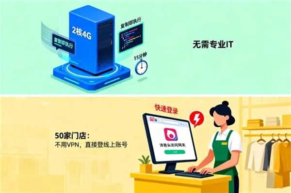 系统自带访问网关,员工无需V P N即可安全访问内网,多网关冗余确保大促期间稳定不掉线。他们的总结是:“部署成本下降80%,账号登录速度提升60%,去年双十一50家门店同时处理订单,零掉线。数据都在企业私有空间,可审可查,安心多了。”