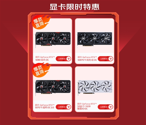 诸多热门型号显卡还将参与限时直降活动!即日起,耕升 GeForce RTX 5080 追风 OC 直降600元,到手价不高于8299元;耕升 GeForce RTX 5070 Ti 追风 OC 2.0 直降500元,到手价不高于6299元。同时还有耕升 GeForce RTX 5070 Ti 炫光超 OC、耕升 GeForce RTX 5060 Ti 16GB 踏雪 X3 OC显卡同步参与活动,更有部分型号还可参加国家补贴政策,让你享受叠加优惠!装机升级的玩家千万别错过这波福利~