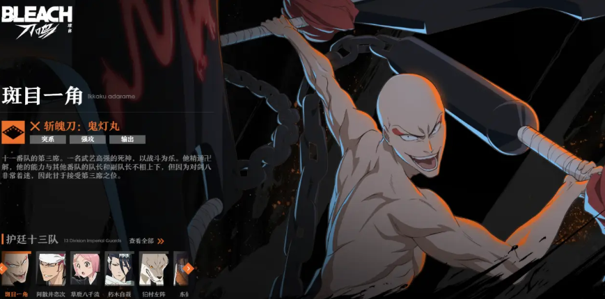 首先为大家推荐的第一个角色叫黑崎一护,黑崎一护也是原版IP当中的主角,目前在这款游戏当中制作成一个主要输出角色,手感以及操作后期都是能够达到T0强度的角色,他在普攻上面一次性就有4段攻击,而且还可以在普攻上面增加一些倍率伤害数值,那么他想要更高的输出,可以在提前把自己的灵压数值积累起来再积攒足够的灵压能量之后,大家可以使用长按的方式将普攻释放出来,此时的基础普攻就会变成一个大范围的攻击能力,那么在战技上面,他还可以先将敌人挑飞,然后再利用一个刺入地面的方式,将敌人压制在下,释放了灵压之后,造成的伤害数值是最高的,那么在必杀技使用的时候,还可以利用他的武器造出一个气刃,这个气刃可以对沿途的敌人都带来一定的输出,所以是具有穿透能力的,在使用封灭技的时候,还可以直接封锁住敌人后期的行动,算作是一个控制技能。