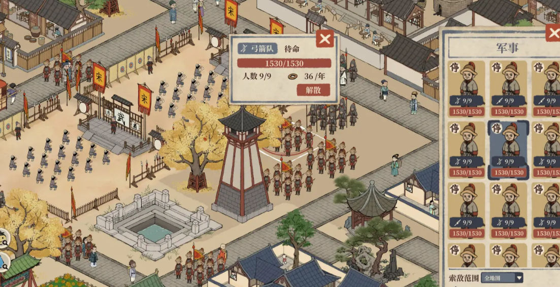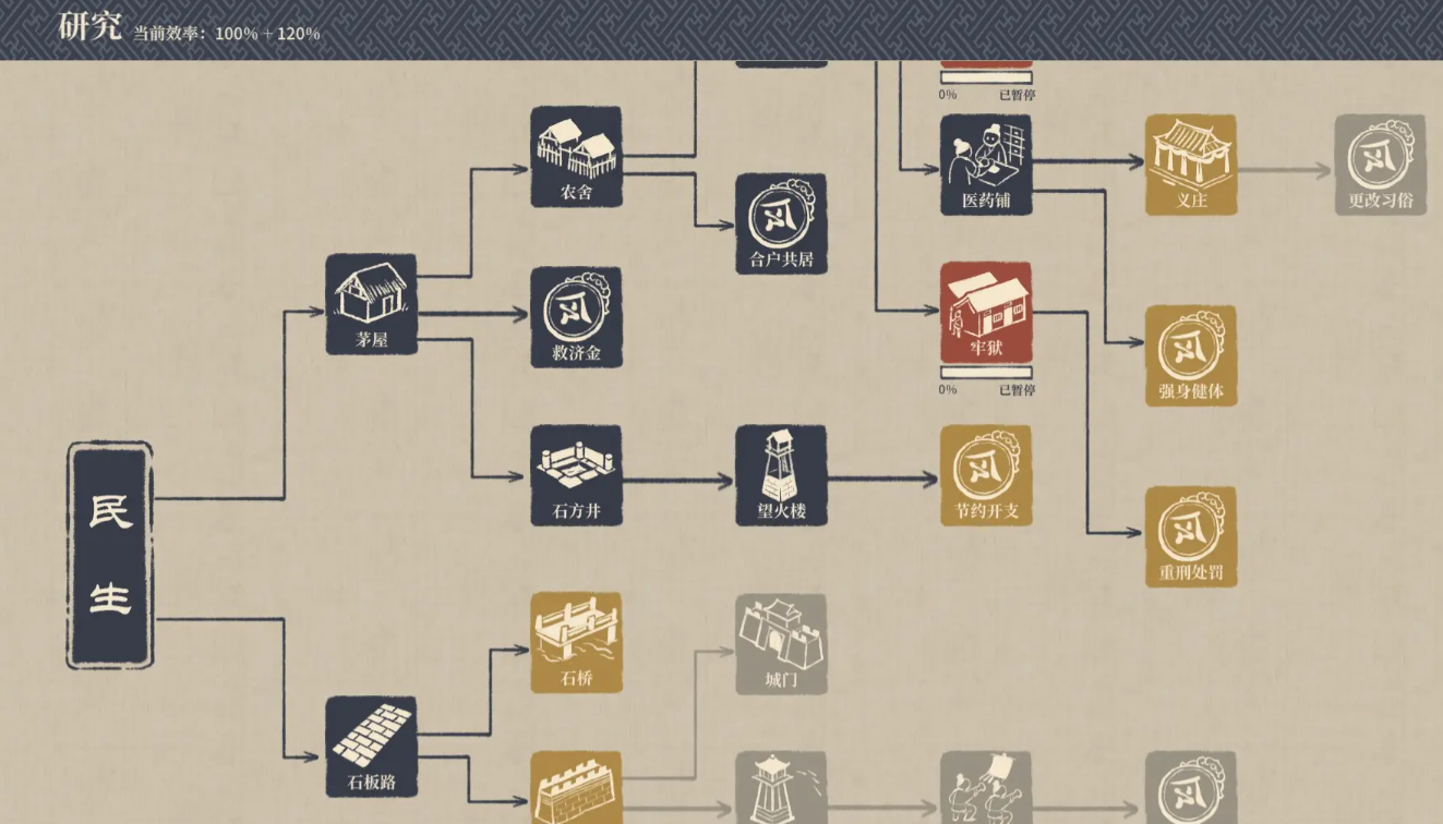 游戏内也有基础的科技建设需要玩家升级,在民生方面,玩家可以升级茅屋,增加茅屋能够储备的百姓数量,也可以选择升级石板路,进化石桥亦或是阶梯,最终修建更为恢弘的城门。