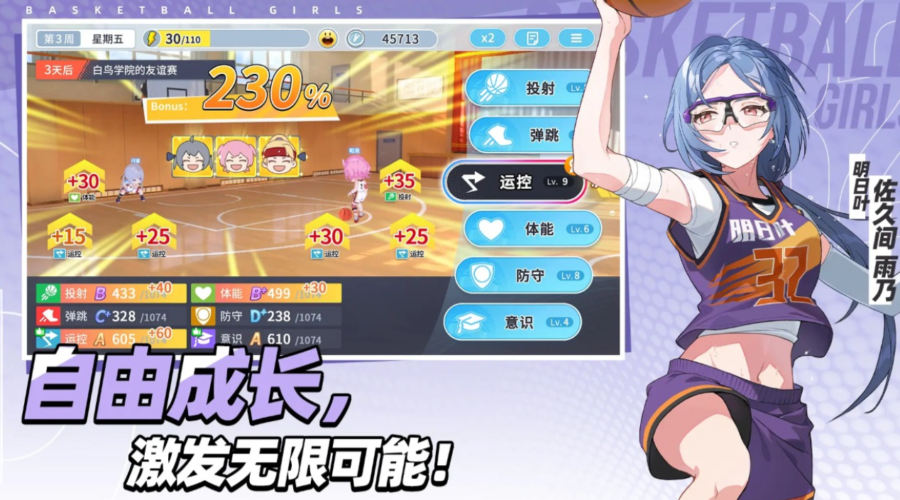 游戏还有属性值基础训练体系,需要玩家完成,玩家需要通过每日合理安排少女们的训练模式,增强她们的体能、运球、投球属性,在赛前时,则建议玩家侧重于少女的体能素质增加。