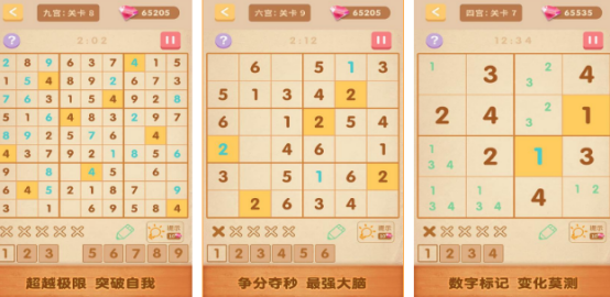 采用九成九宫格设计的数独手游,通过推理的方式将1~9数字填入其中,每和每列都不能重复。加入超级丰富的特色模式,不仅有普通的数独,还有多样化谜题,在探索关卡时,如果遇到难题无法通过,可利用数字标记的方式来助力你通关,让整个速度关卡变到变化莫测。