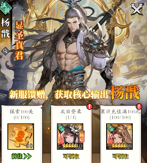 对于新服玩家而言,现在刚刚开服的签到活动一定不要错过,在登录之后就可以拿到好东西。例如第2天登录就可以获取杨戬,第5天还有第6天还可以获得资源奖励。新服还有一个专属的杨戬降临活动,在完成时还需要符合三个条件,分别是探索100关,累计充值100元,还有次日登录。在满足之后就可以直接把杨戬抱回家,在有了这一个核心输出之后,那一开始的养成还是比较省心的。想要更加的省心,那就直接通过第1次充值拿到孙悟空,这也是一开始冲6星的好选择。