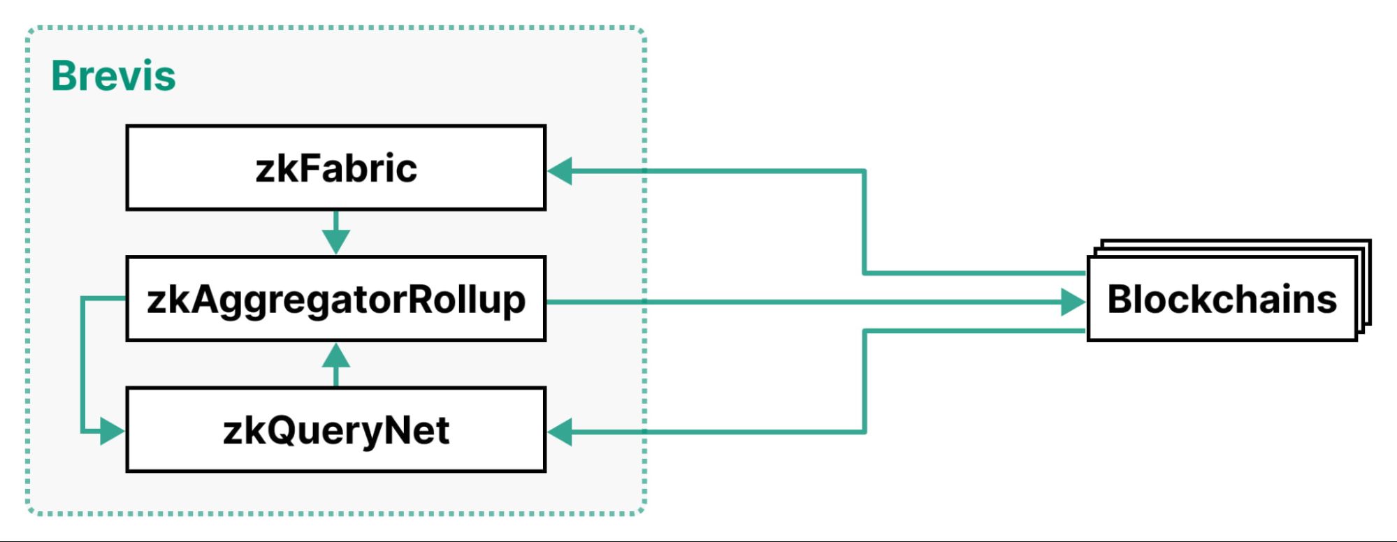 Brevis 作为一个全新的零知识(ZK)多链数据证明平台,旨在为去中心化应用(dApps)提供无需信任的数据访问、计算和利用功能,其核心架构由 zkFabric、zkQueryNet、zkAggregatorRollup 三个主要组件组成。