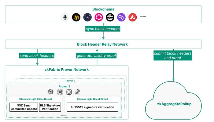 zkFabric 的工作流程可以比作一个快递服务,它负责从各个区块链“取货”(收集区块头),然后通过一系列“检查站”(生成零知识证明)来验证货物的真实性,最后将这些经过验证的区块头“派送”到一个中心仓库(zkAggregatorRollup),具体的工作流程如下: