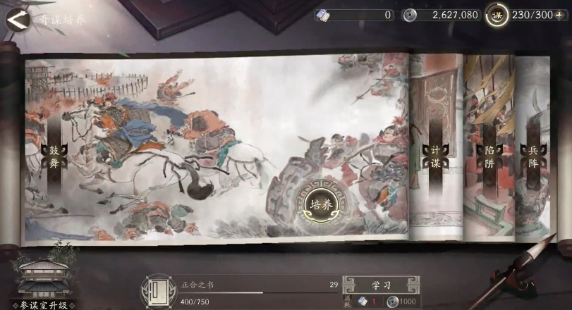 参谋是是研习奇谋的重要场所,他结合了鼓舞、计谋、陷阱、兵阵这四大类奇谋,玩家在战斗过程当中离不开这四部分,在这里可对这四部分的启蒙进行快速培养和学习,不过每一次的学习都会消耗一本奇书和1000个银币,目前游戏当中的奇谋包括上百个,从哗变之策到伏兵之策,再到一鼓作气、猛火计,玩家都可一一进行学习。