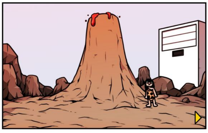 切换场景后可以发现一座火山,一个原始人和一个巨型空调。原始人说着听不懂的话,而火山中有一个卡带。
