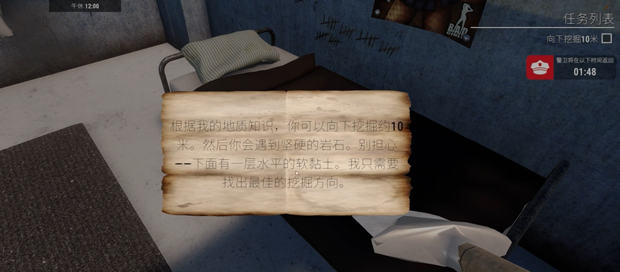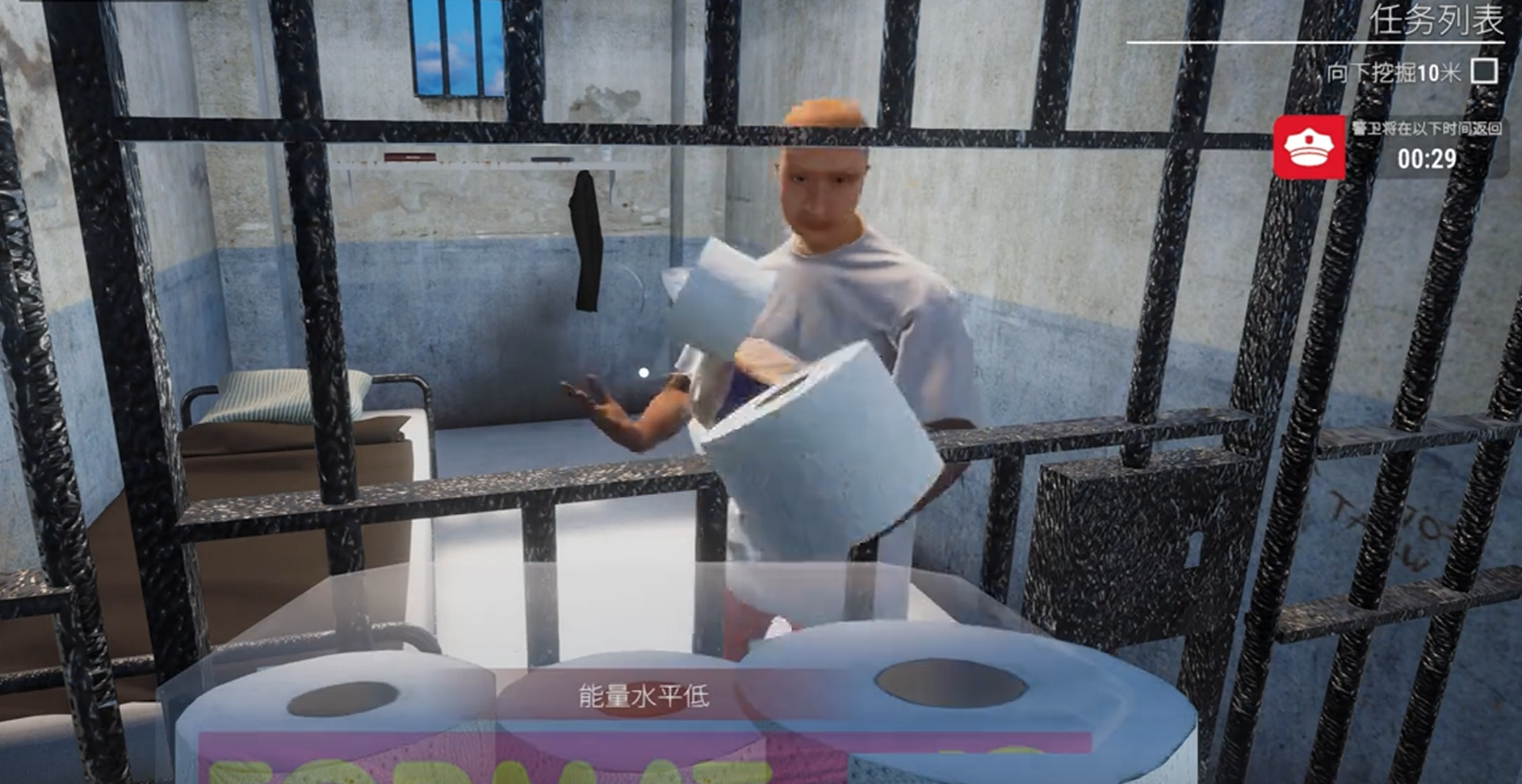 挖隧道是一个非常庞大的工程,玩家每次挖掘都会消耗大量的体力值。当体力值见底以后你就不能再挖掘了,所以想要尽快的挖掘出一条隧道,那么你最好找到一个趁手的工具。每天中午吃饭的时候,玩家可以多拿一双筷子和一个勺子。再回到监牢以后,玩家只需要掀开这里的地毯就可以挖掘隧道了。挖掘隧道会发出巨大的声响,所以小伙伴们每次挖掘一段时间,都要将头伸到监牢外面探望,一旦玩家在挖掘隧道的时候被警察发现,那么这局游戏就会直接结束了。