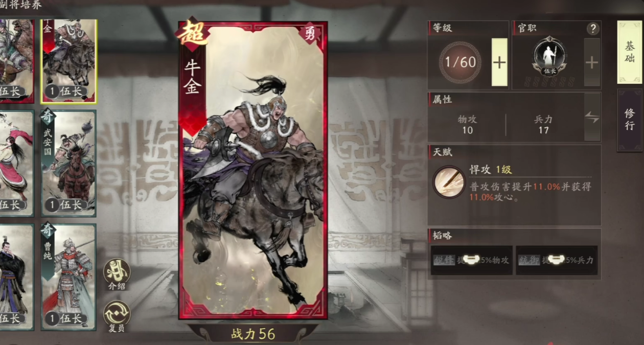 在基础属性方面,牛金初始提供10点物理攻击加成与17点兵力值。当玩家解锁其韬略技能后,还能为全队带来5%的物理攻击力提升及5%的兵力加成。这项团队增益与曹仁的进攻类技能形成良好联动,进一步放大整体输出效率。