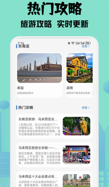 这款应用专为有出行需求的用户打造,提供覆盖广泛的旅游目的地信息,无论是国内游、出境游,还是户外露营等小众玩法,都能在这里找到对应的准备指南。平台不仅整合了各大景点的详细介绍与游览建议,还包含当地特色饮食推荐、亲子出游方案以及自助旅行路线设计等内容。每个景点均配有注意事项说明和装备清单提示,帮助用户提前做好全方位准备。