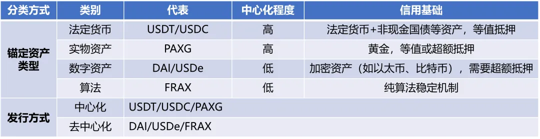 根据是否去中心化可以分为:中心化稳定币和去中心化稳定币。所谓的中心化是指有固定的发行机构,中心化稳定币通常由公司或机构主导发行,凭借其资源整合与信用背书,确保稳定币价值的稳定。而去中心化稳定币则是依靠智能合约与区块链技术,实现社区自治,赋予用户更高的透明度与自主性。稳定币的分类如下图框架: