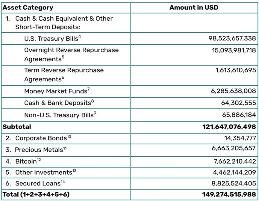 公司的负债为用户存入的美元,相当于公司的资金来源,而公司将这部分资金投向能产生利息的资产,形成了公司的资产。下图为Tether公司2025年一季度的资产情况: