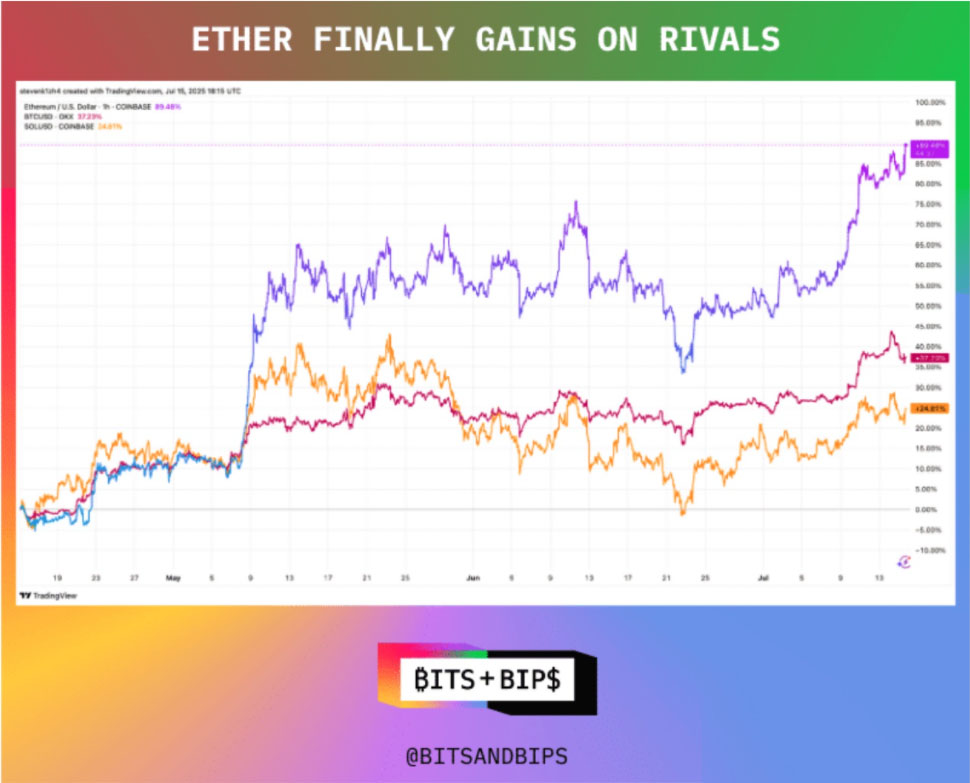 当前 ETH 价格约为 3088 美元,正迅速收复与比特币和 Solana(SOL)等主要资产之间的差距。过去三个月里,以太坊涨幅接近 90%,远超其他主要加密资产的表现。