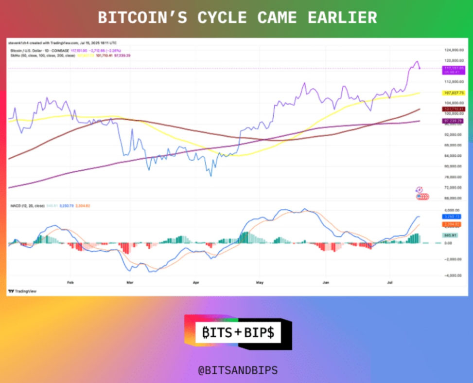 这一观点也得到了比特币对比图表的支持。比特币的 MACD 上穿更早发生,且是在零轴附近完成,表明其上行周期起步更早,没有经历以太坊此前那种明显的负面情绪和价格压力。比特币的黄金交叉出现在 5 月中旬,4 月就已突破 200 日 SMA,显示其行情领先。