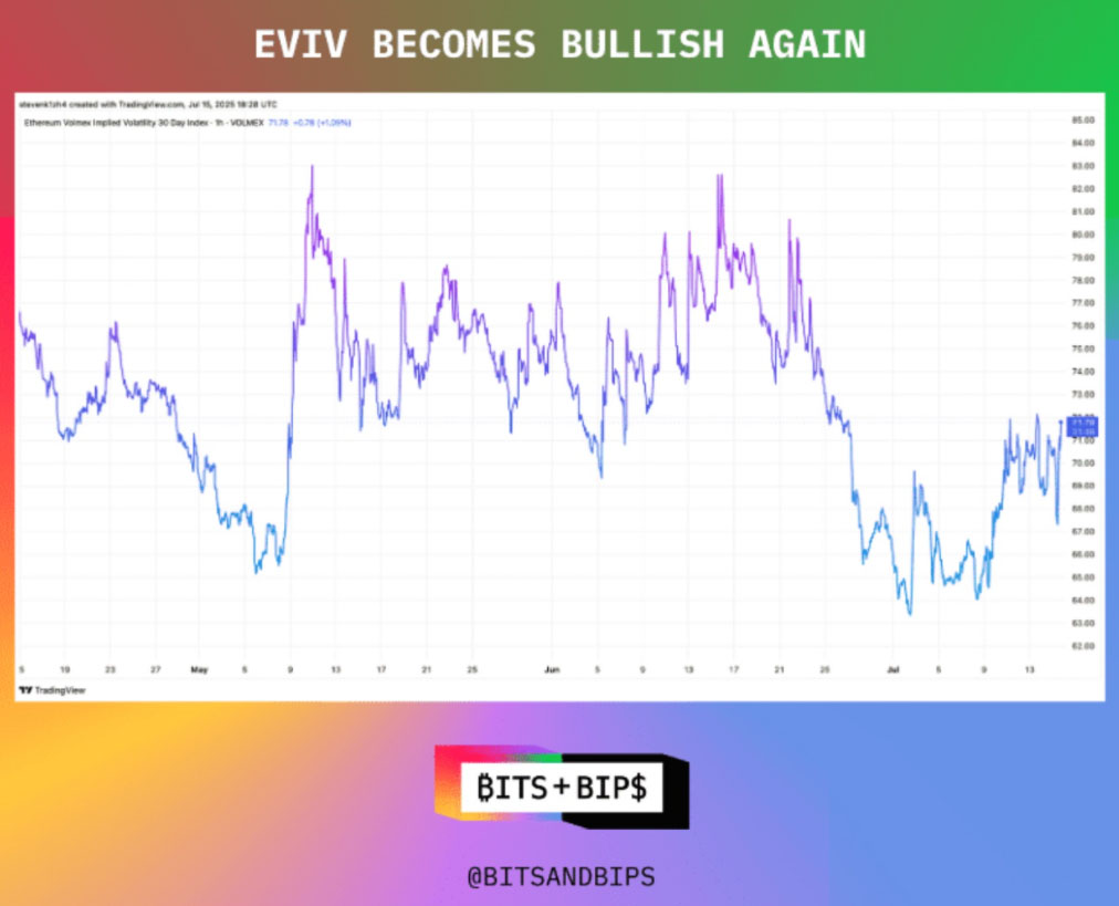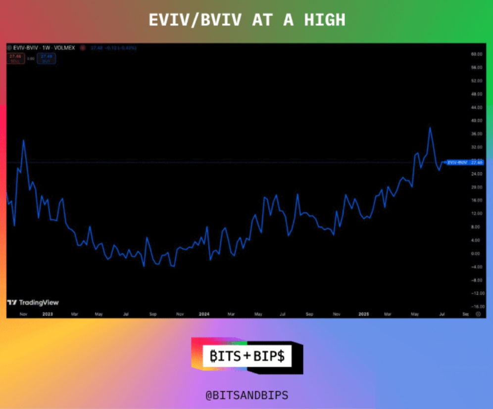 对于 ETH,有几个有趣的现象正在发生。首先,Ethereum Volatility Index(EVIV)在 6 月底短暂下行后又开始回升。更重要的是,它相对比特币的波动率水平也在提升,达到了自 2022 年以来的最高水平。这通常意味着市场对 ETH 的看涨情绪在增强,后续动能有望持续。