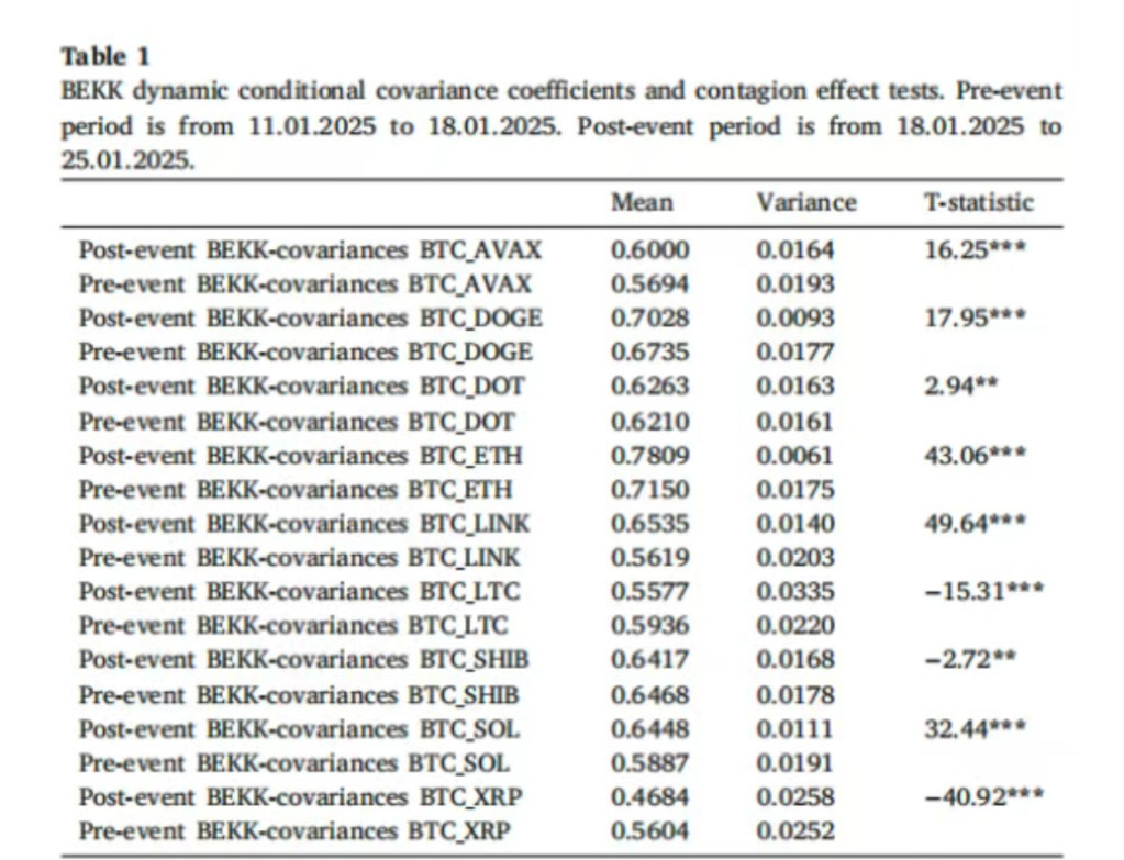 表1展示了通过BEKK-MGARCH模型估算的动态条件协方差,并附有相应的t检验统计量,用以验证是否存在传染效应。结果表明,该事件在加密货币市场中确实引发了金融传染与波动率溢出效应。大多数事件后期的协方差系数在显著性水平0.001处显著,尤其是像ETH、SOL和LINK这样的资产对之间,其协方差显著上升,显示出更强的联动性与更高的市场整合程度。相比之下,SHIB和DOT虽然也达到了0.01的显著水平,但影响较弱。另有一些资产如LTC和XRP在事件后协方差反而下降,说明溢出效应并非在所有资产之间均匀分布。整体来看,结果突显了此次Meme币发行事件对整个加密货币市场的结构性影响。