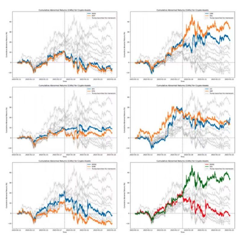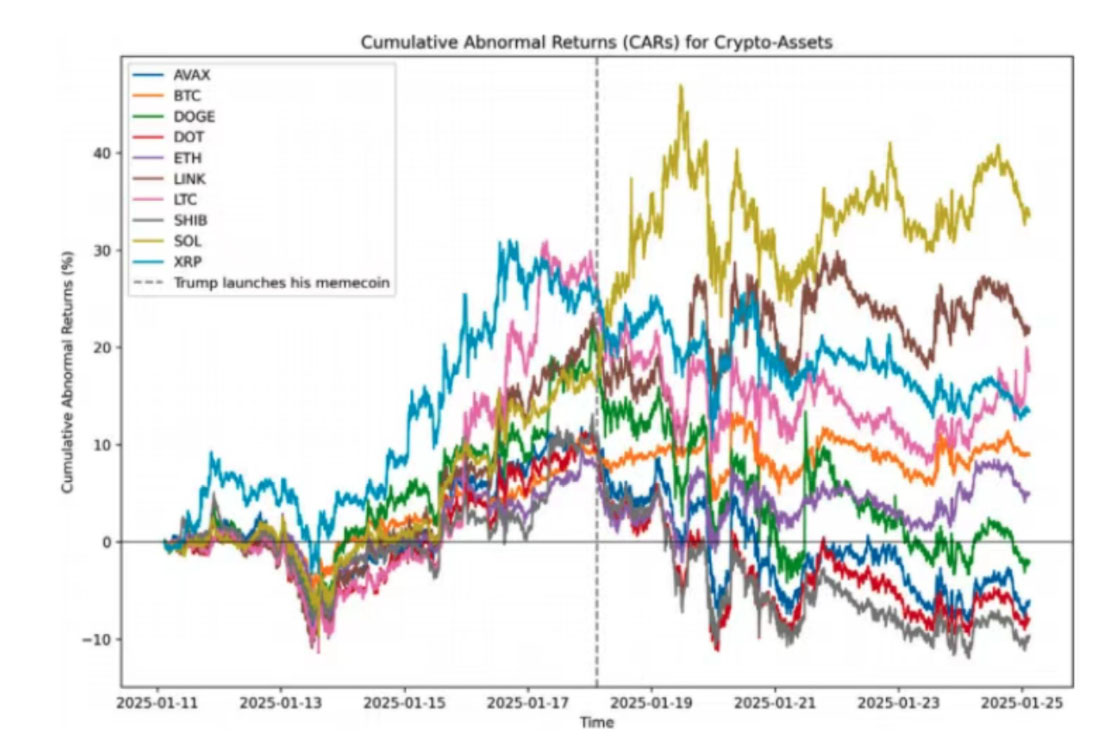 在已证实加密资产之间存在异质性影响的基础上,本节通过累计异常收益(CARs)的分析,进一步揭示了特朗普Meme币发行引发的信息级联效应。结果表明,该事件对市场动态具有显著的结构性影响,表现为资产特定的反应路径与加剧的波动性。