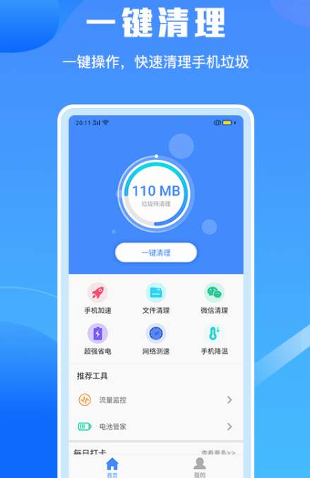 专为长期使用手机却缺乏定期维护的用户设计,只需一键点击即可自动扫描并清除各类缓存文件、广告残留和冗余数据。此外,内置网络测速模块,可实时检测当前连接质量,辅助判断卡顿原因。还设有健康打卡功能,鼓励用户培养良好的生活习惯。