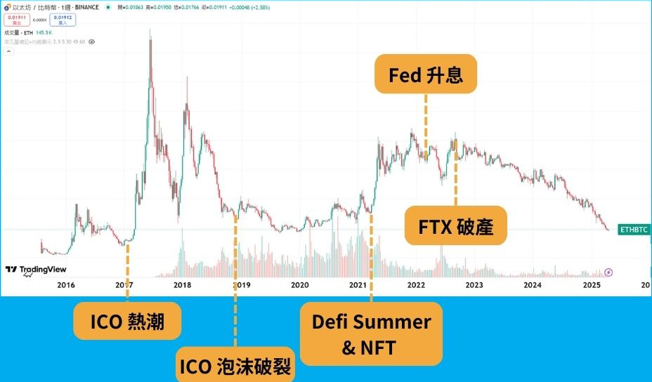 当ETH / BTC 上升,表示以太坊相对比特币更具表现,市场信心偏向ETH;