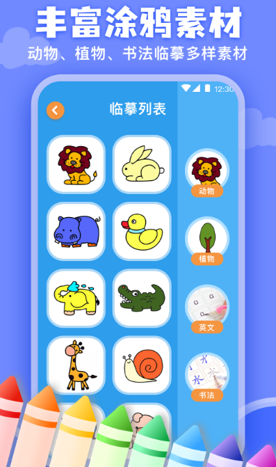 专为儿童打造的绘画平台,提供纯净画板与大量线稿资源,便于孩子在线进行涂色与自由涂鸦。应用内集成书法临摹模块,搭配多样画笔工具与缤纷色彩选择,极大吸引儿童使用兴趣。特有的电子白板功能支持多种笔刷切换,可自由绘制图案、添加文字说明或标注内容,亦可作为日常记录工具使用,激发孩子的创造力与表达力。
