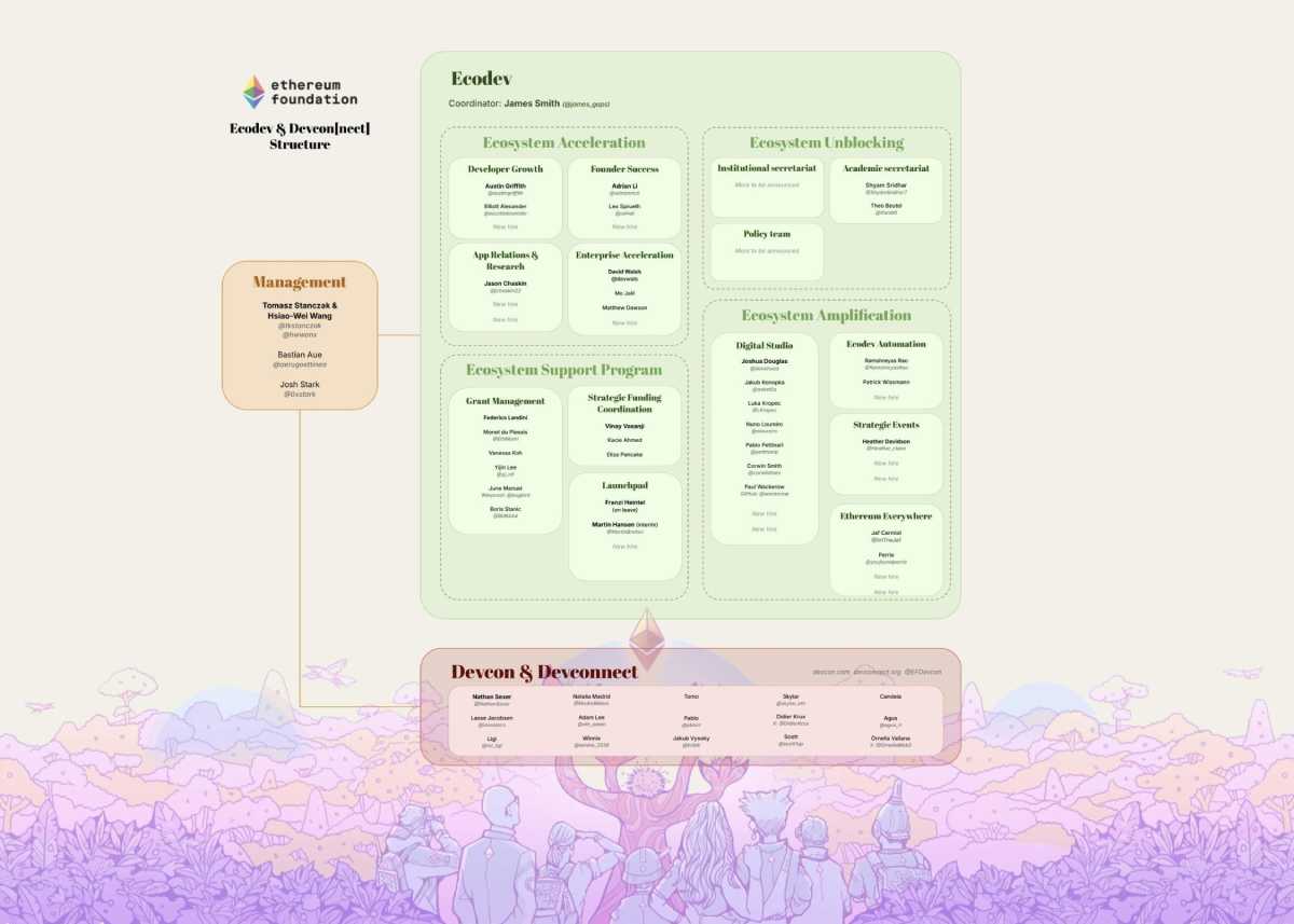进入 7 月,以太坊基金会(EF)发布重大架构调整声明,明确提出四大战略支柱:“加速、放大、支持、长期疏通”,意图更系统化地推动以太坊的规模化落地与应用生态扩展。这一改革从过去的“放手式治理”转向更加主动的资源调度与跨社区协调,标志着 EF 正走向更制度化、外向型的组织形态。