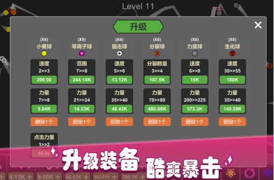 非常佛系,结合放置打砖块等休闲元素,采用无上限关卡,持续生成砖块,让玩家消除拥有割草般的爽快感。复刻曾经游戏机中经典打砖块模式只是在球球的设定上包含6种不同种类,通过升级速度力量等属性,提高打砖块的效率。模拟真实的物理引擎不同砖块布局会直接影响反弹效果。