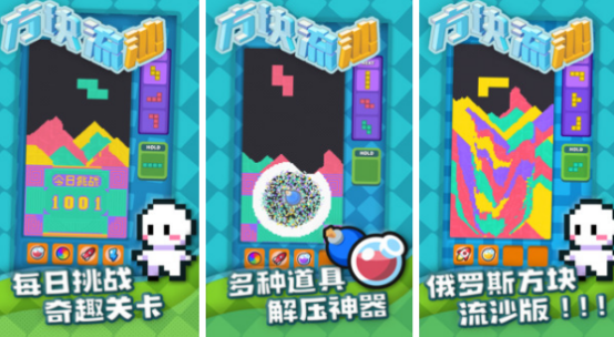 俄罗斯方块与创新的流沙机制结合,方块每次下落时都会以流沙形式展现,视觉效果极为独特,也让玩家觉得非常新奇,融入物理引擎交互方块受重力影响下落,玩家在移动方块操作时要足够精准,避免掉落失败。针对于不同玩家分为多个难度,逐步解锁复杂关卡。