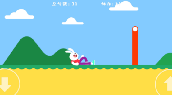 小兔子在一条到处充满危机和陷阱的道路上,逐渐完成跳跃,天空上不光有大量的金币,同时还有各种美味的水果,比如火龙果和西瓜等等。屏幕的左右两方有上下的箭头,当奔跑时,遇到突然间长出的棍子或者是高墙时,点击向上的箭头,让小兔子完成跳跃,直至快速到达终点。