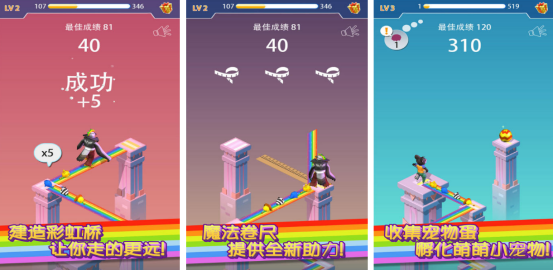 绚丽多姿的彩虹不光会在天空上呈现,甚至也可以让你亲自建设出彩虹桥,让你走得越来越远。在你的面前,将会看到两个没有任何衔接物品的平台,如果想成功跳到下一个平台上,那么通过蓄力的方式建造彩虹桥,顺理成章的走到下个平台中,但每两个平台之间的距离完全不同。成功走到下个平台上时,可收集大量的宠物蛋。