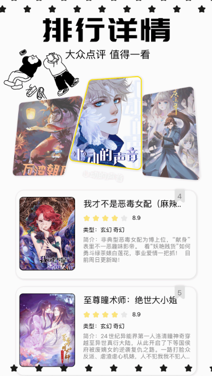 这是一款集阅读与创作为一体的综合性漫画平台。除了提供海量正版授权资源外,还设有专属图库和动漫壁纸专区,适合喜爱二次元文化的用户浏览收藏。分类系统细致清晰,尤其擅长呈现各类美型角色内容,方便快速查找心仪作品。每日更新精选推荐,搭配图文解读功能,提升阅读趣味性。更有绘画教学模块,手把手引导用户完成创作,激发艺术潜能。
