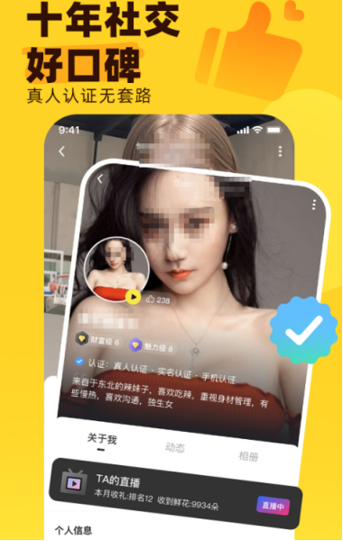 作为一款拥有上亿次下载量的热门社交应用,吸引了众多高颜值单身男女入驻。用户可以通过才艺展示、语音连麦、视频互动等方式增进了解。无论是唱歌、跳舞,还是分享日常拍摄的照片和短视频,都有机会获得他人关注。点赞、评论、直播互动等多种形式让交流更自然,也许一段美好的缘分就从一次简单的互动开始。