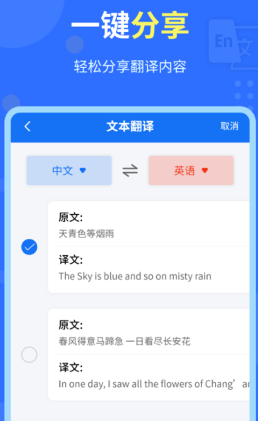 这款翻译应用凭借出色的性能和稳定的输出,在用户中积累了良好的评价。它集成了拍照识别、一键分享等便捷功能,能够迅速将图片中的英文内容转化为中文,适合办公场景下的即时沟通需求。无论是处理外文资料还是出国旅行查阅菜单标识,都能轻松应对。翻译结果支持本地保存或直接转发给他人,极大提升了信息传递的效率。