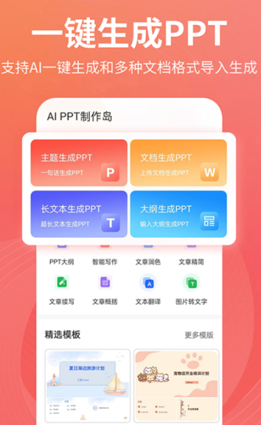 无论是工作汇报、项目提案还是教育培训,PPT都是展示思路的重要工具。此应用提供智能化生成服务,只需输入内容要点,即可自动生成结构清晰、视觉美观的幻灯片。拥有丰富的主题样式和图形素材库,支持多种文件格式转换,满足不同场合下的演示需求,帮助用户快速打造专业级演示文档。