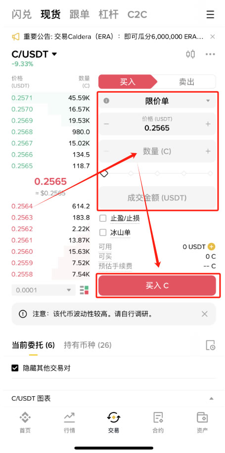 5、依次选择【限价单】-购买【价格】-购买【数量】-【成交数量】,设置好之后,点击【买入C】。