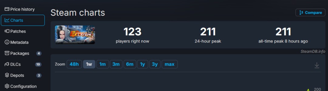 《格斗领域EX》在Steam大降价后,Steam在线迎来一波小幅度回暖,出现了最高在线峰值,但也仅仅是211人同时在线。