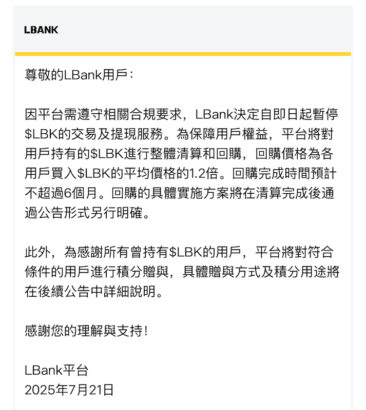 因平台需遵守相关合规要求,LBank决定自即日起暂停$LBK的交易及提现服务。为保障用户权益,平台将对用户持有的$LBK进行整体清算和回购,回购价格为各用户买入$LBK的平均价格的1.2倍。回购完成时间预计不超过6个月。回购的具体实施方案将在清算完成后通过公告形式另行明确。
