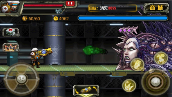 一个僵尸题材横版射击手游,游戏采用闯关模式,总共有120多个关卡,20多种僵尸,而且还有boss战。玩家通过虚拟摇杆控制角色移动,点击屏幕射击放技能,游戏设计了十多种可升级的枪械,可以选择两种携带进入关卡,支持自由切换以方便应对不同种类的僵尸,而且还加入了核弹、全屏冻结等技能,游戏角色也可以通过升级和穿戴装备提升属性。