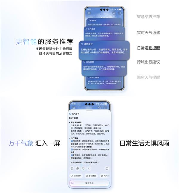 此次升级最令我惊喜的,是华为天气展现出深度的智能能力。传统的天气应用主要提供基础天气预报,而华为天气的智能体服务,则实现了从被动查询到主动关怀的转变。在天气有变化时,天气助手能及时提醒用户关注气温变化,清晰告知未来几天的温度变化幅度,并给出添衣防寒的建议,使天气服务真正融入你的生活,成为你的贴心伙伴。此外,你还可以点击提醒卡片,通过智能语音进行深度天气问答,例如询问“今天下午是否适合户外跑步”或“今日出行建议”,天气助手会结合多维天气数据给出专业且具体的答复。