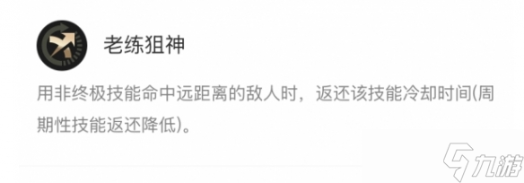 老练狙神:用非终极技能命中远距离的敌人时,返还该技能冷却时间(周期性技能返还降低)。